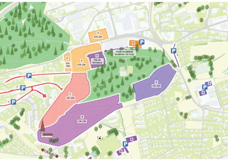 Durant les périodes mentionnées, il sera impossible de quitter les zones indiquées en voiture ou d’y entrer. Pour les personnes qui souhaiteraient se rendre aux abords de Villars-sur-Glâne ou souhaiteraient pouvoir en sortir, des parkings gratuits sont prévus à Nuithonie, au Platy, dans le centre commercial de Fribourg Sud.